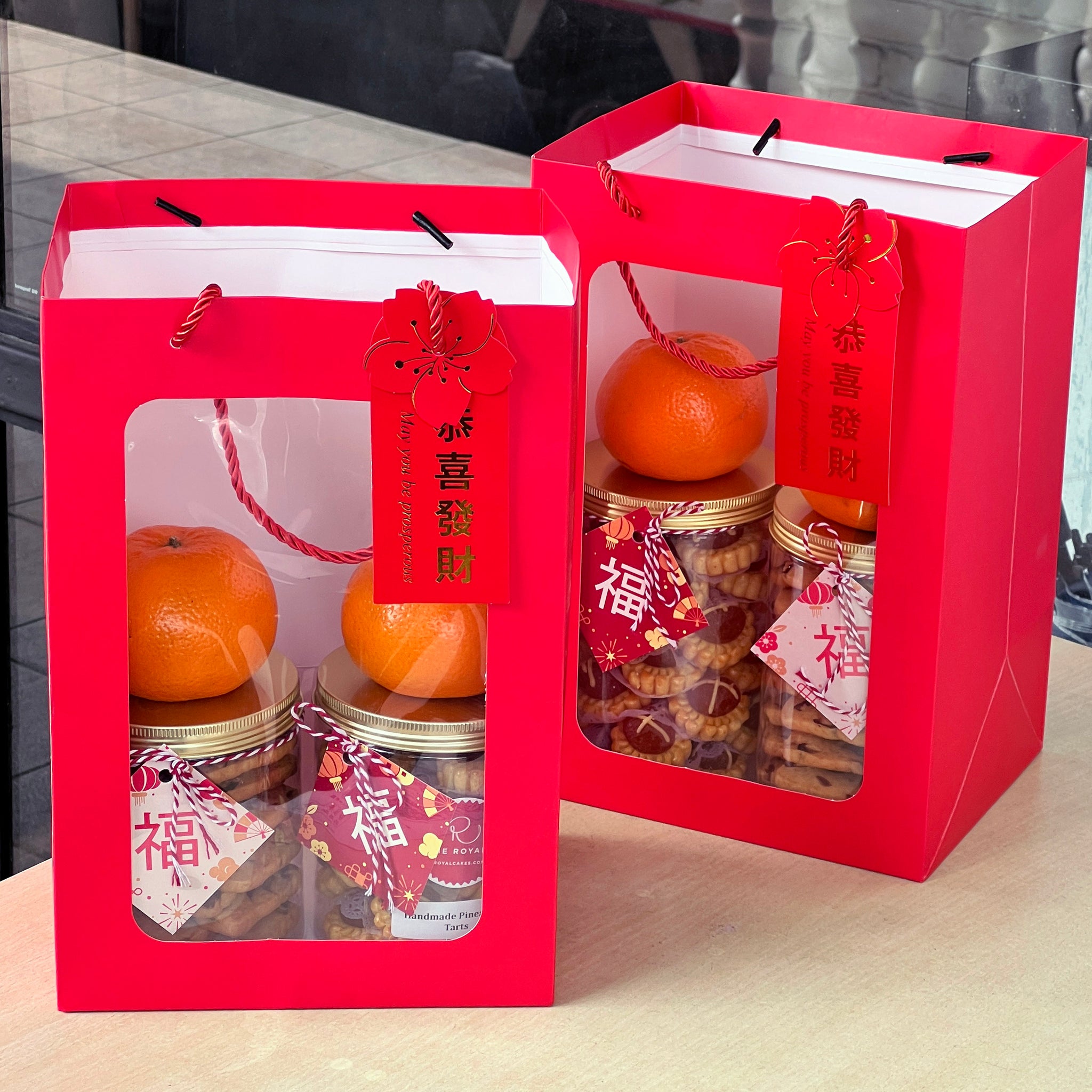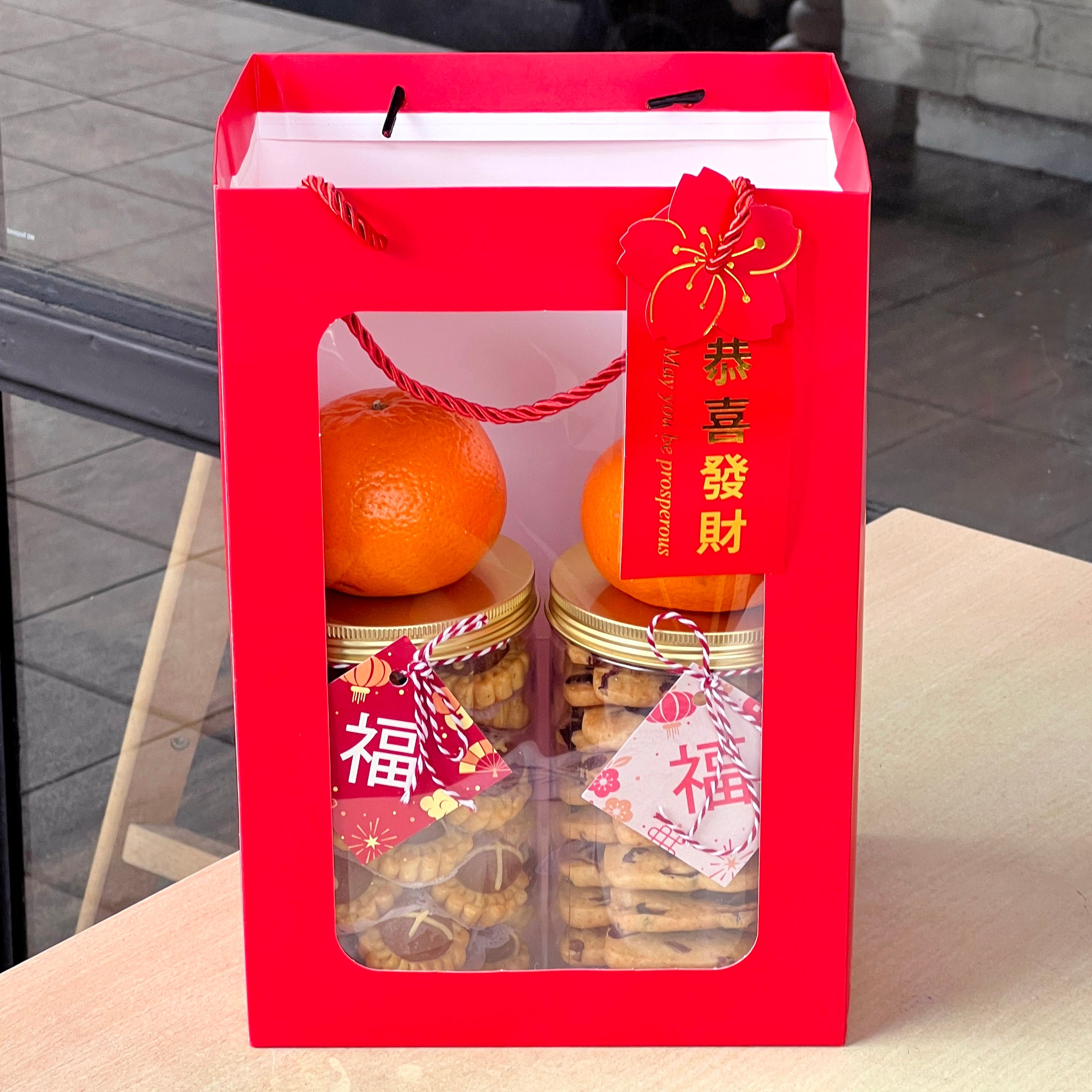 Set comes with 2 cookie tubs (choice of medium or large) + CNY gift bag + 2 mandarin oranges!